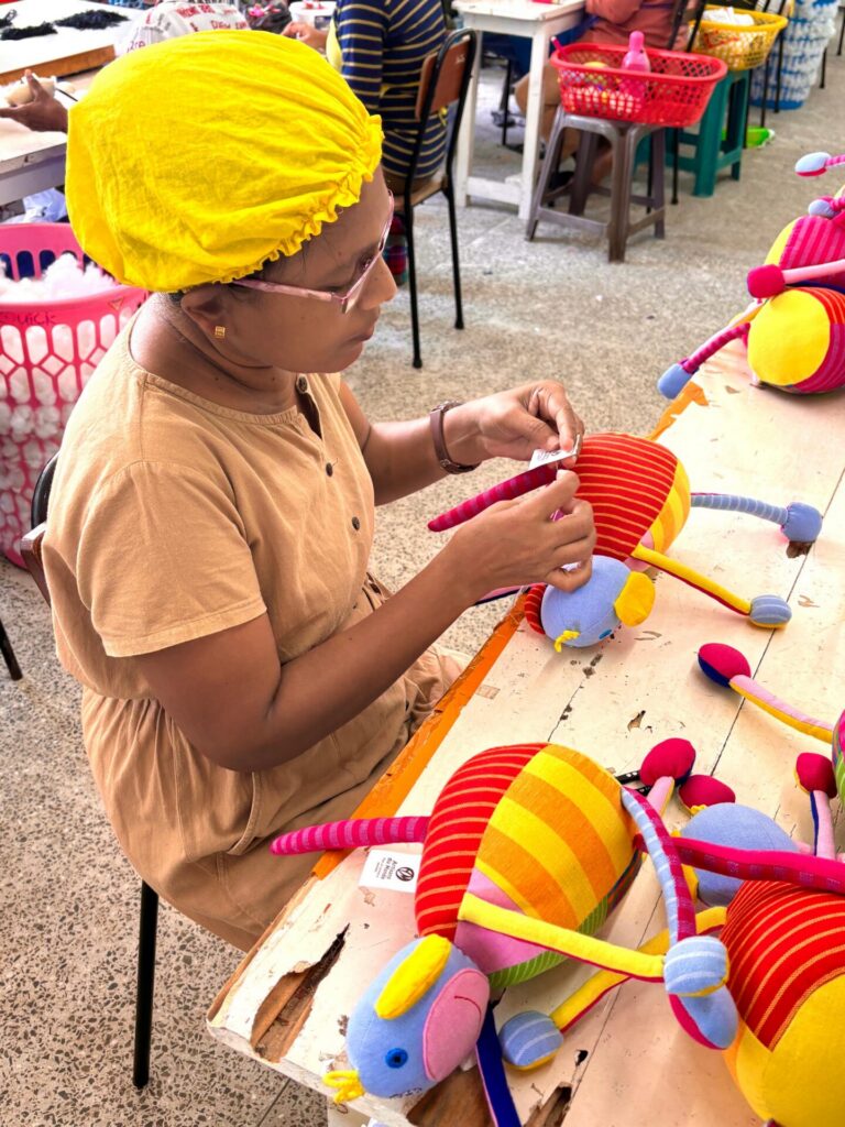 Ici, le tissage se fait à la main. Les producteurs tissent une myriade de tissus, qui deviennent des textiles d’intérieur, des vêtements et des jouets pour enfants. Les fils de coton sont colorés avec des colorants écologiques non toxiques. Cette étape dure 36 heures. Le fil est ensuite monté sur des bobines grâce à une machine à filer avant d’être utilisé pour le métier à tisser. Les tissus des jouets sont découpés puis assemblés par les couturiers avant d’être rembourrés manuellement et brodés pour certaines pièces. C’est alors que les hochets animaux, les balles en tissu, les peluches ou encore les marionnettes colorées prennent vie.